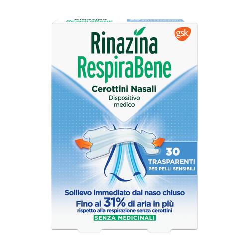 RINAZINA RespiraBene Dispositivo medico. Cerottini nasali trasparenti per pelli sensibili. Sollievo immediato dal naso chiuso. Fino al 31% di aria in più rispetto alla respirazione senza cerottini. Senza medicinali. Formato Confezione da 30 cerottini.